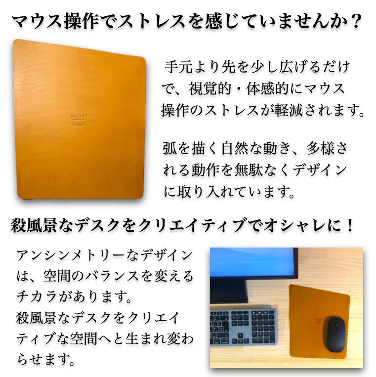 高級イタリアンレザーのタンニンなめし革なので使うほどに馴染んでいき、経年変化を楽しめます。また、Motion-Edgeが開発したストレス軽減のオリジナルデザインにより、デスクワークをシンプルでおしゃれな空間に仕立てます。